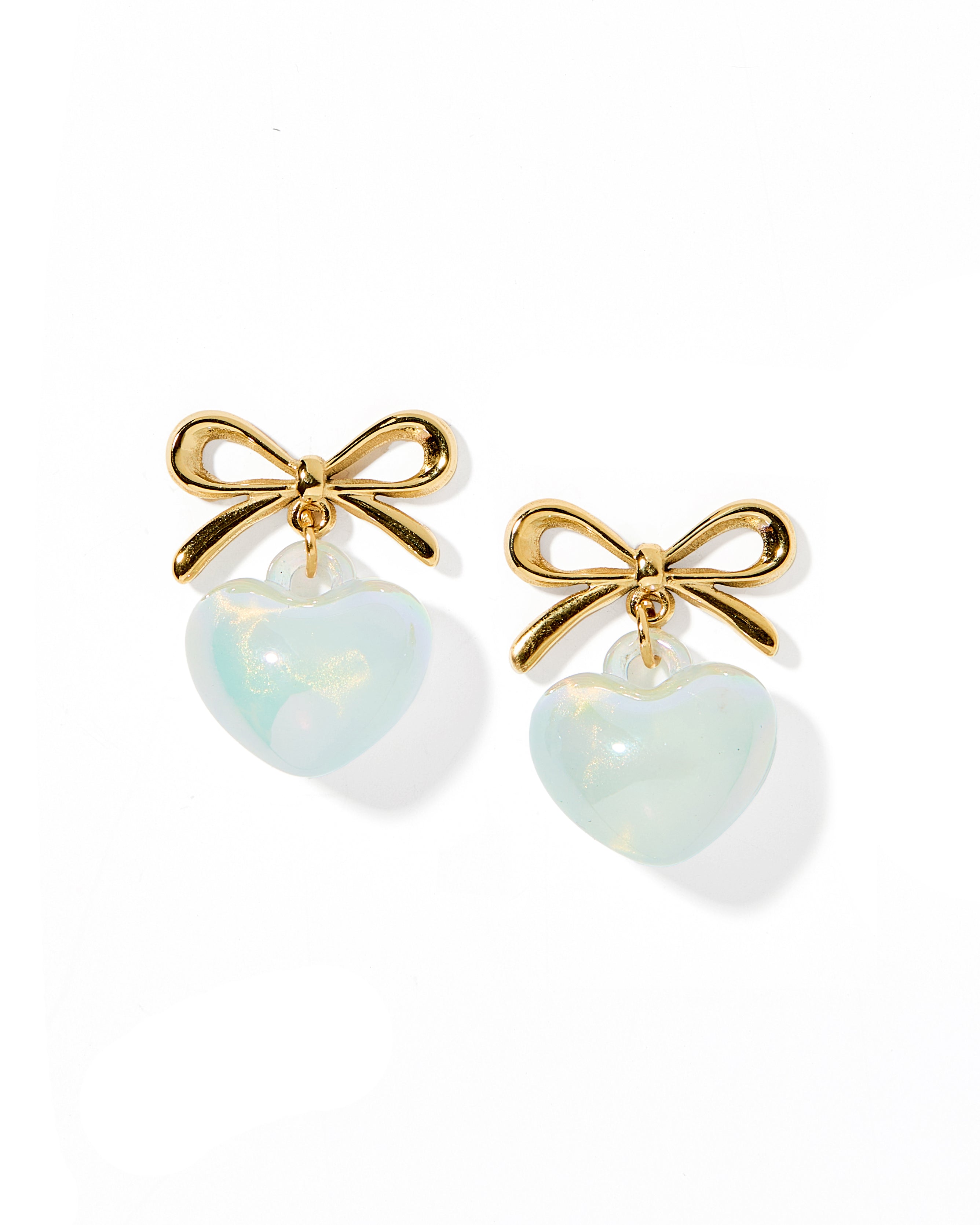 The Ruthie earring is a gold-plated stainless steel bow pendant earring with an acrylic bubble heart. She is 23mm long in size and is a light-weight staple for every stylish gal.
