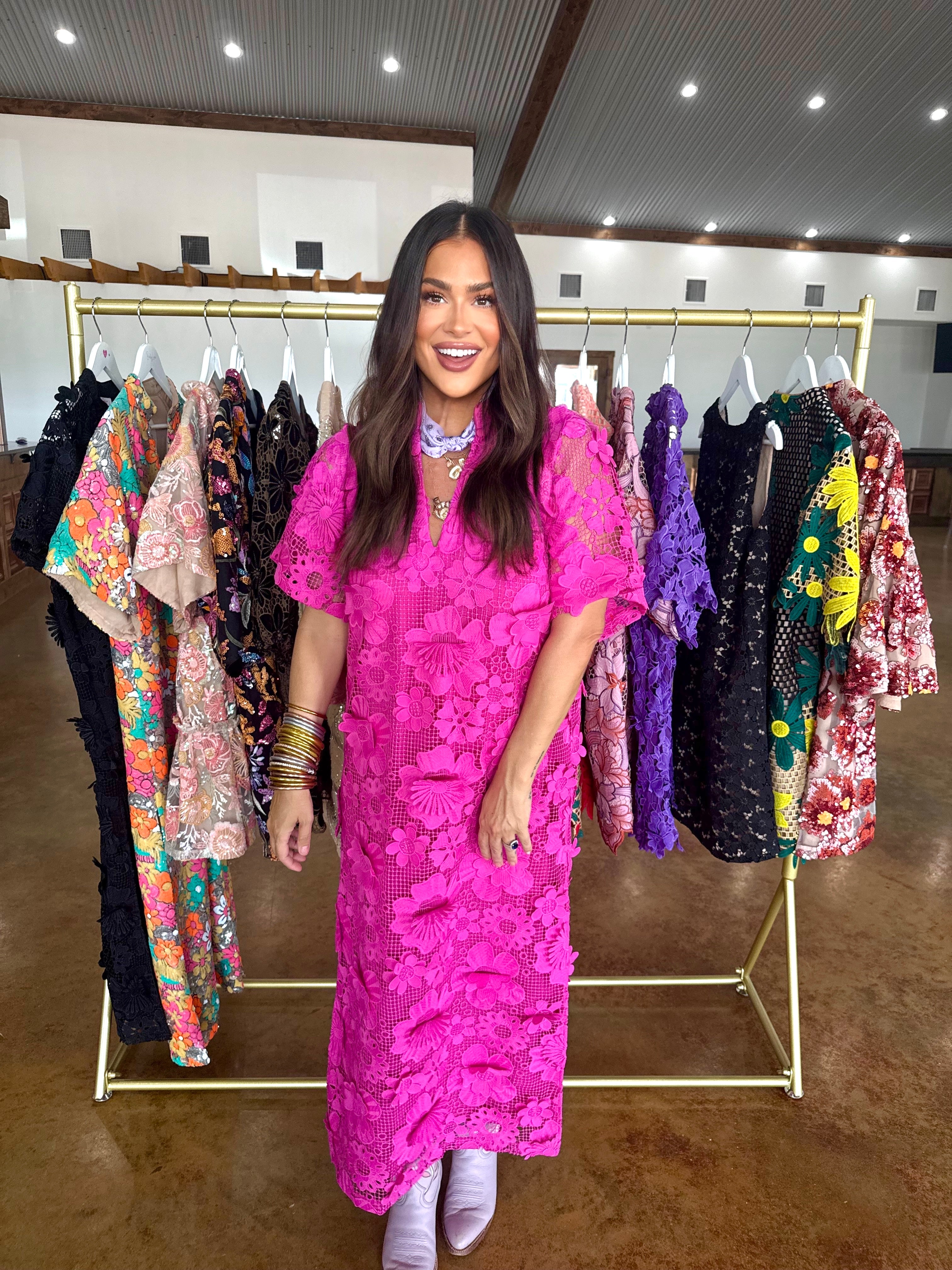 Our Leighton Dress redefines your style! Her loose fitting silhouette, two slits right below the knees, and her STUNNING floral pattern makes her a perfect addition to your wardrobe!
