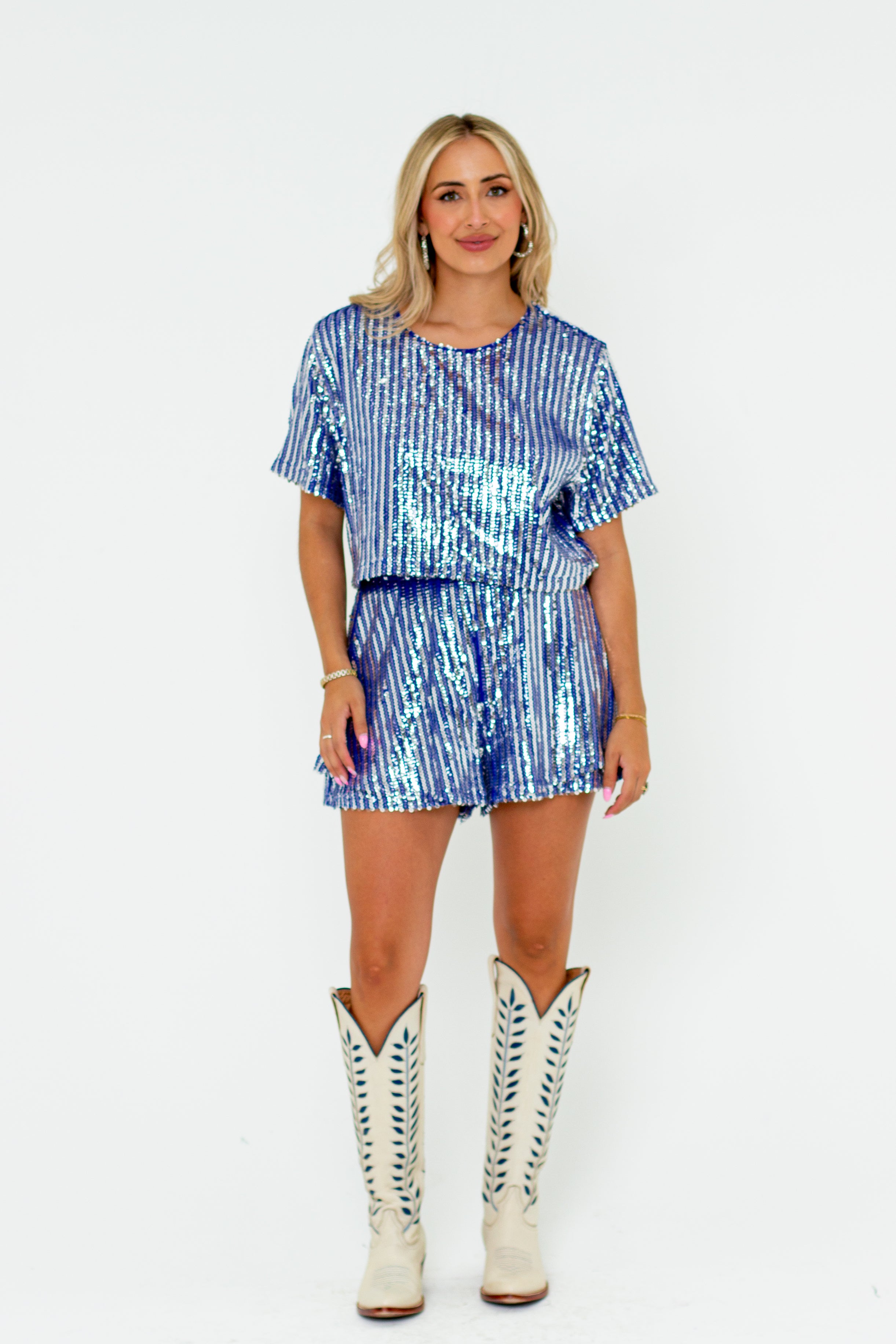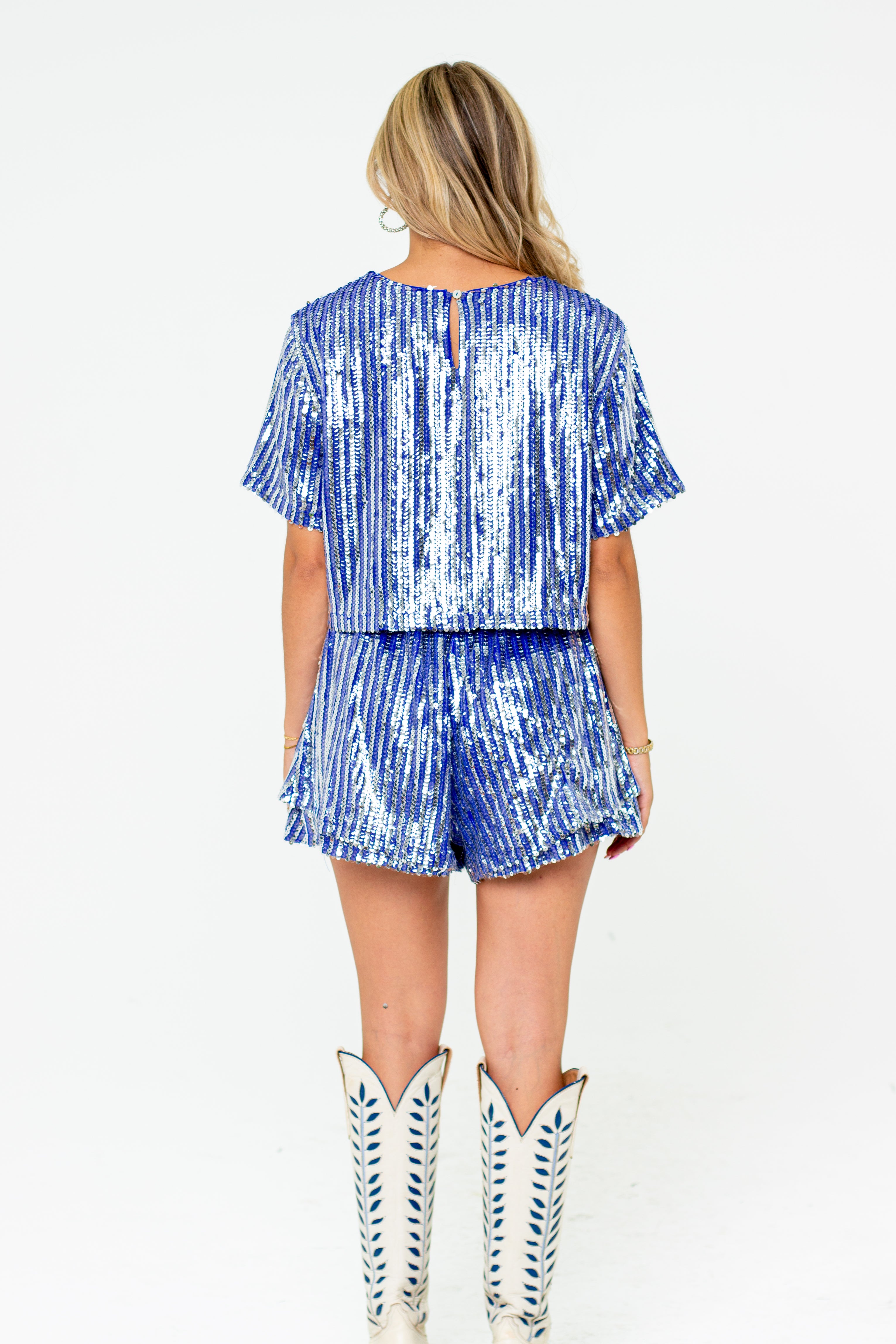 You'll always be the center of attention when you've in the Laura Set! The Laura Set features a boxy short sleeve sequin cropped top with a key hole button closure and elastic waist band sequin shorts with a zipper closure in the back. The shorts also feature an extra ruffled layer on each side for a flattering fit.