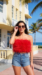 Fancy Strapless Feather Crop Top - Crimson
