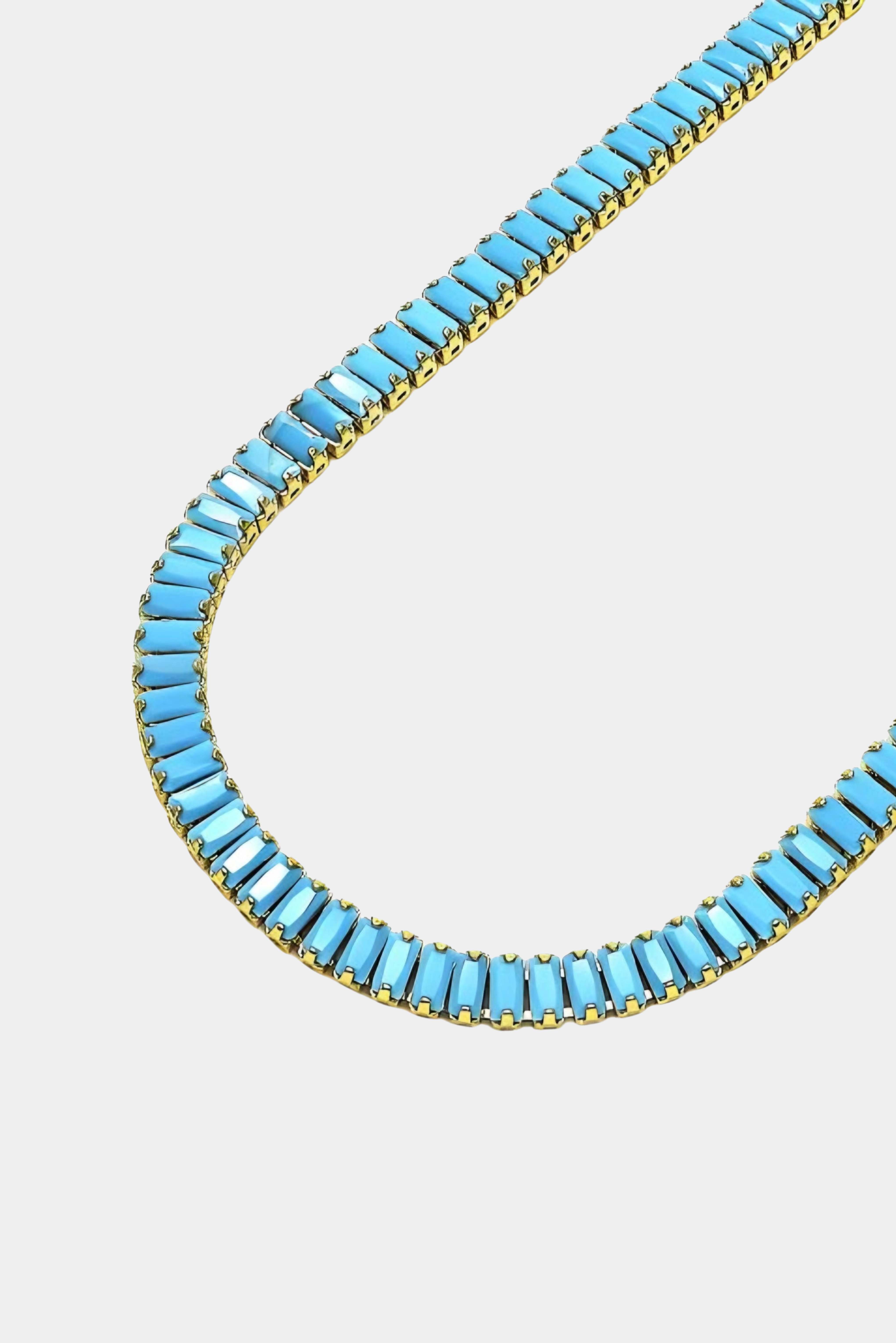 The Funny Girl Necklace features a rectangular turquoise-colored design. Durable and elegant, this necklace is perfect for any occasion.