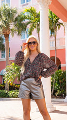Our Mandy Blouse is flirty and fun! She features a tie closure, ruffled shoulders, and long sleeves with an elastic trim. We recommend sizing down if in-between sizes! Pair her with leather leggings and booties for a night out!
