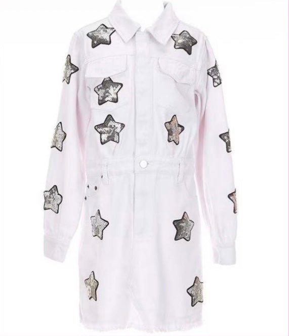 White Starstruck Denim Dress- Tween