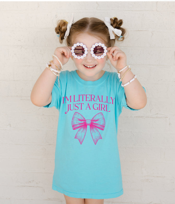 "I'm literally just a girl" screenprinted to last on Comfort Color's Lagoon Blue tee.