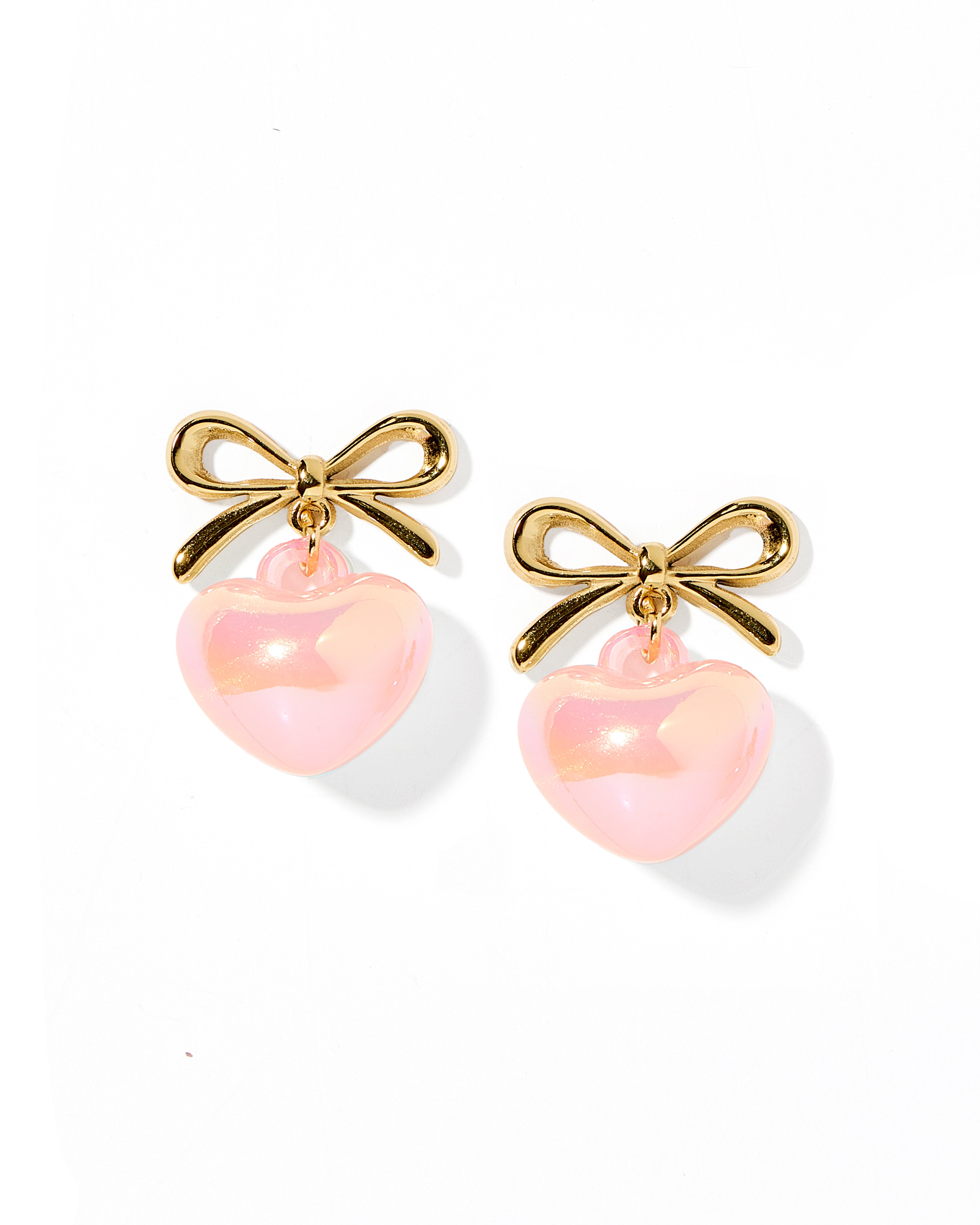 The Ruthie earring is a gold-plated stainless steel bow pendant earring with an acrylic bubble heart. She is 23mm long in size and is a light-weight staple for every stylish gal.