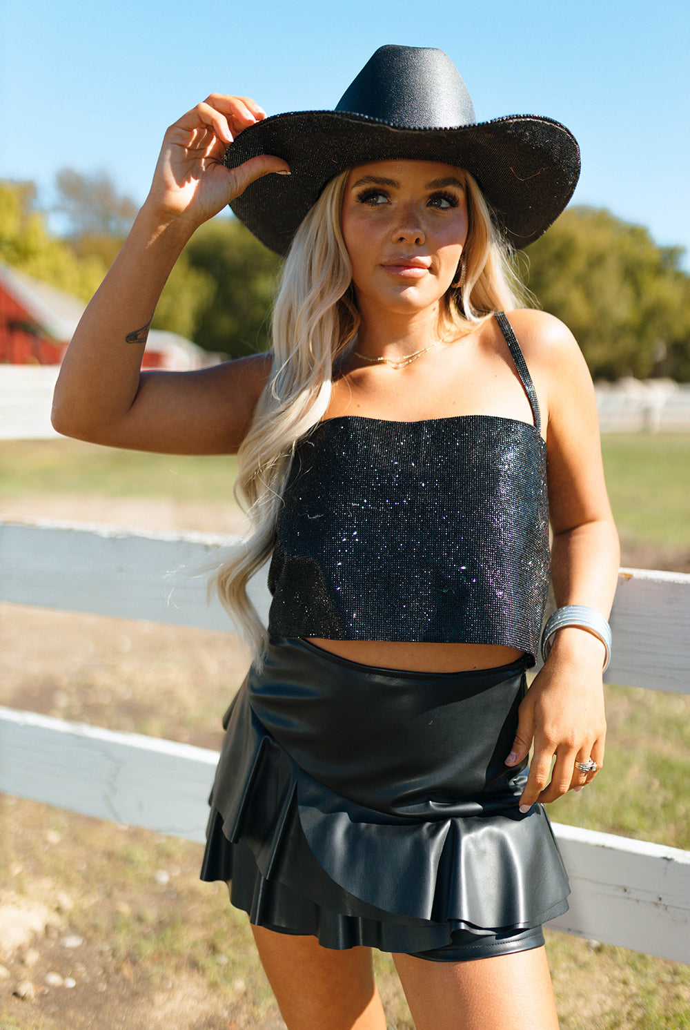 Find your favorite rompers, mini dresses, sequin outfit sets, denim shorts, vegan leather skirts, fringe suede jackets, faux fur jackets with fringe, and trendy western boots in this collection of country glam outfits and cute western dresses for women. Express your unique sense of style with fabulous and flirty glam cowgirl outfits and individual pieces.